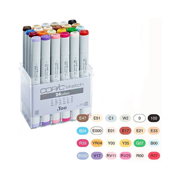 Таким образом маркеры Скетч от Too Corporation обладают двумя перьями с обеих сторон. Каждое перо маркера можно заменить на новое или перо другой формы, поскольку производитель создал широкую линейку сменных пишущих узлов для своих маркеров Copic Sketch.