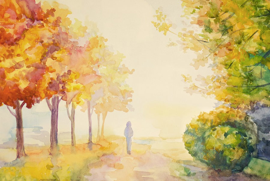16. Полусухой кистью методом тычка рисуем кроны деревьев, опавшую листву небольшими мазками тех же цветов и травку.