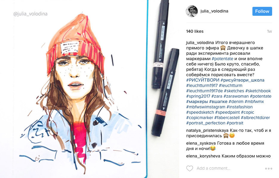 В 2012 году я вернулась к рисованию живыми материалами после многолетнего перерыва, имея за плечами детскую художественную школу и 10-летний опыт работы графиком-дизайнером (как ни странно, рисовать руками «по долгу службы» приходилось очень редко). Перепробовала все материалы, до которых смогла дотянуться: цветные карандаши, пастель, лайнеры, акрил, акварель. Очень скоро в рамках домашнего рисования мне стало тесно, захотелось простора, чего-то нового и интересного. Позапрошлым летом я открыла для себя такой материал, как маркеры, и увлеклась городскими зарисовками. Это капиллярные ручки в основном на спиртовой основе, обычно имеют очень богатую гамму цветов, позволяют добиться акварельных эффектов путем наложения слоев, очень интересный и удобный для работы на улице материал.