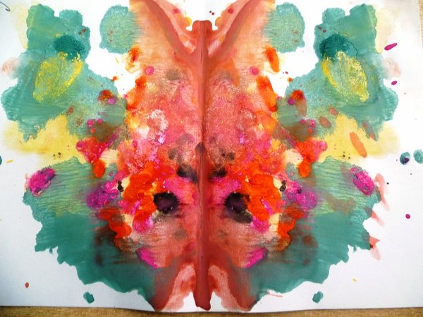 Развернуть и положить перед собой. На правую половину листа накапать несколько «клякс» разных цветов (акварелью, тушью, гуашью) так, чтобы они легли рядом, но желательно, чтобы они при этом не смешивались.