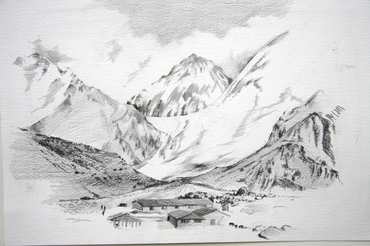 - Рисуем дальние горы. Слишком детализировать не нужно, достаточно показать горные выпуклости и впадины, разломы в камнях. Для этого достаточно рисовать что-то вроде небольших треугольничков с темным основанием. Покажите часть гор более обще, они будут находиться далеко от зрителя. Не заштрихованные участки тоже оставляйте, чтобы было ощущение освещенности солнцем. Обозначьте край земли, узкую полоску у подножия гор.