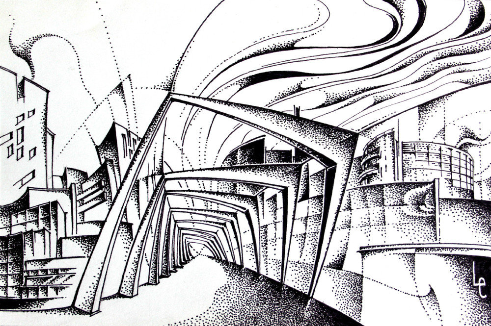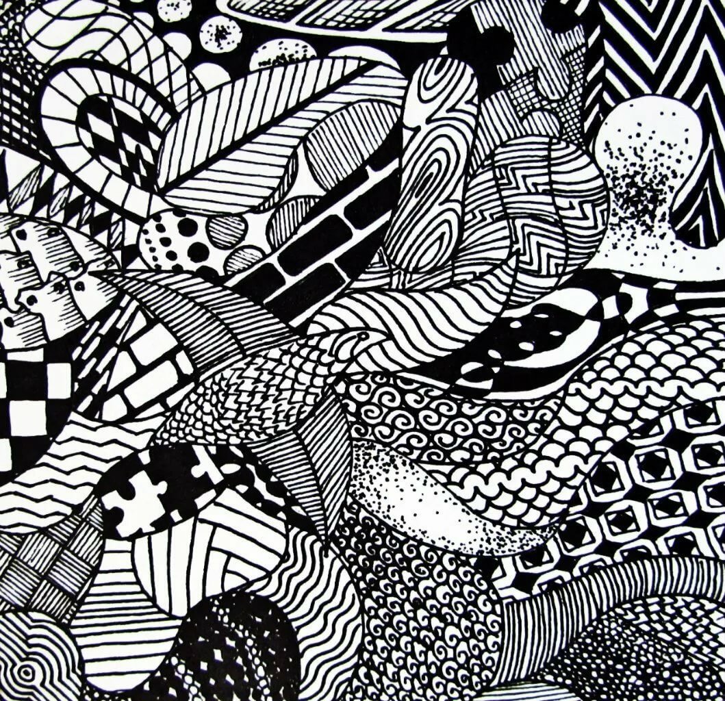 - Стилистическое единство характера формы всех элементов композиции. Стилистику графического образа в данной работе определяет характер пластики плавных, перетекающих очертаний элементов изображения. «В графике есть некоторые особенности композиции. Выражению пространства здесь отводится подчиненное место, его может и не быть» [5, с. 68]. Замкнутая система структурных линий, формирующих визуальные образы, являются своеобразным монолитным каркасом композиции, которая на фоне фактурной плоскости определяет комбинацию переменных средств гармонизации художественно-графического сочинения: ритм, динамику, асимметрию, полярность контрастных и нюансных соотношений. Восприятие реагирует на любой нюанс. «Особая прелесть графического произведения — в ее тонкой ассоциативной связи с какими-то реальными предметами, а не в их иллюзорном (факсимильном) воспроизведении.