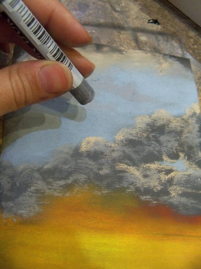 Работаем сверху вниз, первый этап – тонирование неба. Тонировать я начинаю с самых светлых моментов, для этого кладу мелок бочком, у меня получается ровный тон. Далее, где требуется, кладу синий, прогалы можно растушевать жесткой кистью или губкой.