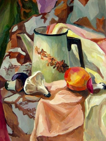 И мне очень повезло, я нашла Настю Кожину, художника-постановщика, которая раз в неделю на протяжении трех лет занималась со мной всяким: под ее руководством я укрощала акварель, акрил и масло, писала натюрморты и выходила на пленэры, составляла рисованные композиции из отдельных предметов, расписывала ткань, в общем, пробовала все, что только можно.