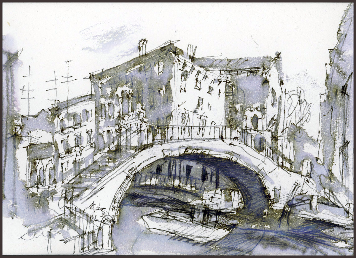 Пейзаж обладает композиционным центром — это мост. Контраст светлого и темного, контраст цветов.