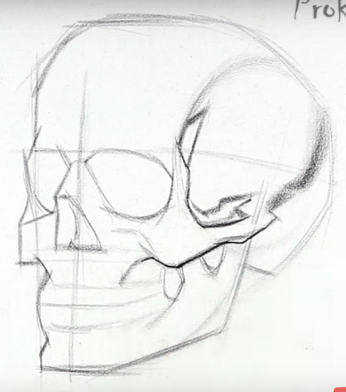 Затем используйте другую изогнутую линию, чтобы очертить контуры лицевых костей — выпуклость лобной кости и носовой кости, а также верхнюю челюсть, где будут прикрепляться зубы.