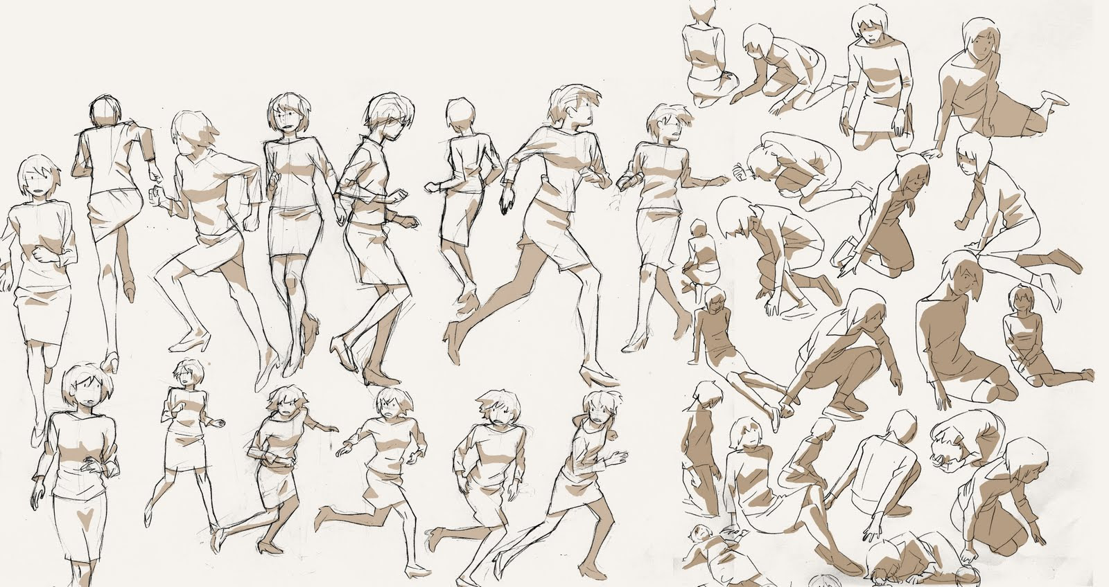 Перекрывающие линии и формы также помогают распознать соотношение пространства и фигуры. Перекрывающие формы обычно указывают на части тела в ракурсе. С помощью устоявшегося метода «сквозной прорисовки» формы становятся завершенными, пространства полностью решены и гораздо больше информации дается художнику, чтобы полностью понять расположение частей тела в той или иной позе. Перекрывающие линии используются в таких местах, как бедра или в ином сгибающимся сегменте тела. На сходящихся линиях одна резко заканчивается и прерывается, а другие становятся касательными. Касательная линия указывает на один объем, проходящий под другим, обозначенным прерванной линией.