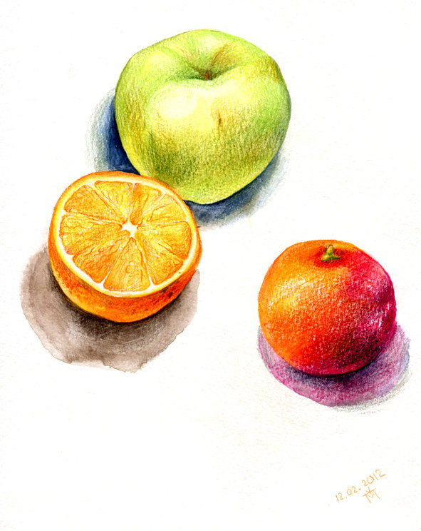 Поэтому, если вам нужно нарисовать фрукты, в данном случае мандарин, давайте рисовать поэтапно простым карандашом. На последнем шаге, возьмите цветные карандаши и раскрасьте рисунок мандарина так, чтобы этот фрукт получился как настоящий. Если вам нужно нарисовать несколько разных фруктов, то кроме этого урока на сайте есть и другие с рисунками фруктов, например урок «Как нарисовать яблоко».