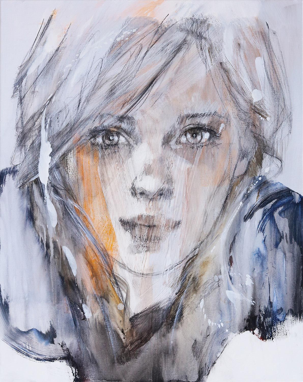 7. Перед работой над деталями даем краскам просохнуть. Чтобы прорисовать контуры глаз и рта, добавить теней в области носа и на участке, где линия волос соприкасается с лицом, смешиваем немного синего кобальта, жженой сиены и добавляем чуть-чуть фиолетового.