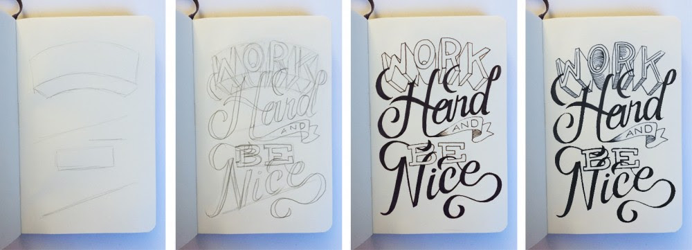 «Затем я делаю наброски слов и смотрю, чтобы они вмещались и были ровными. Не бойтесь, если ваши буквы заходят за край других букв. Затем я обвожу их тонкой ручкой и стираю карандаш. Наконец, я добавляю все детали и затемнение».