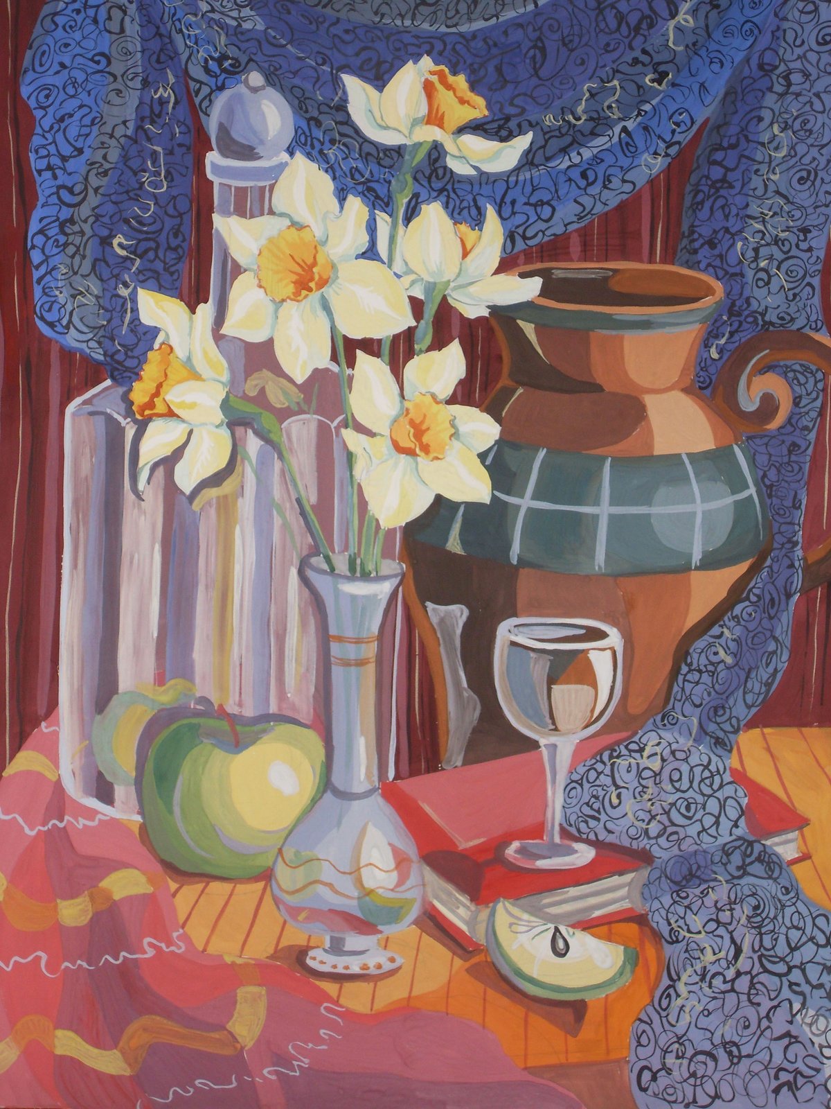 Сначала намечаем все предметы. В нашем случае это кружка с цветами, яблоки и деревянный стол. После того как все предметы заняли свое место, начинаем прорабатывать форму, а затем детали. Финальное действие — это изображение фактуры. Кружка приобретает горизонтальные полосы, цветы и яблоки — светотеневую границу. Обязательно нужно показать фактуру стола. Желательно в натюрморте совмещать горизонтальные и вертикальные линии, чтобы предметы не сливались, а выгодно выделялись на фоне друг друга.