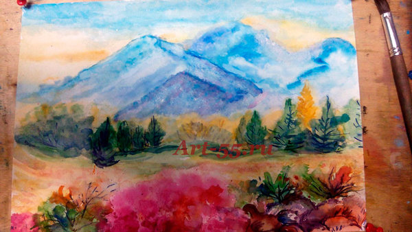 Ну, а теперь рисунок можно повернуть «правильно» и нарисовать серо-голубые облака и практически сухой кистью «затуманить» пространство от земли до «кучки», которая, как вы, вероятно, уже догадываетесь, является вершиной горы (ну, пусть это будет Килиманджаро).