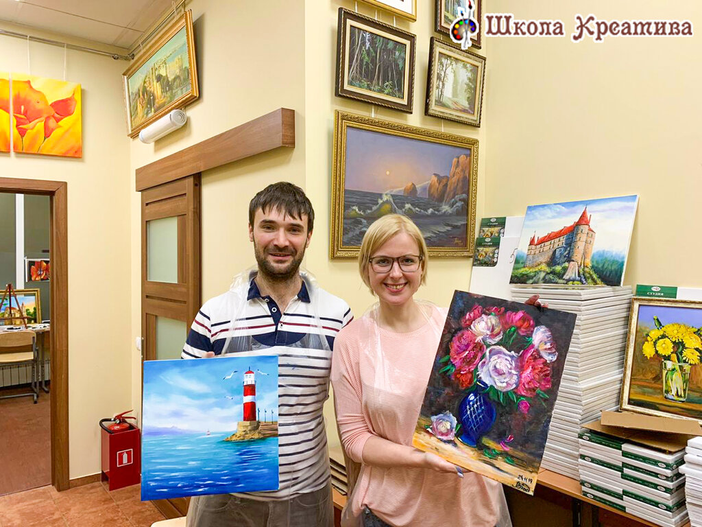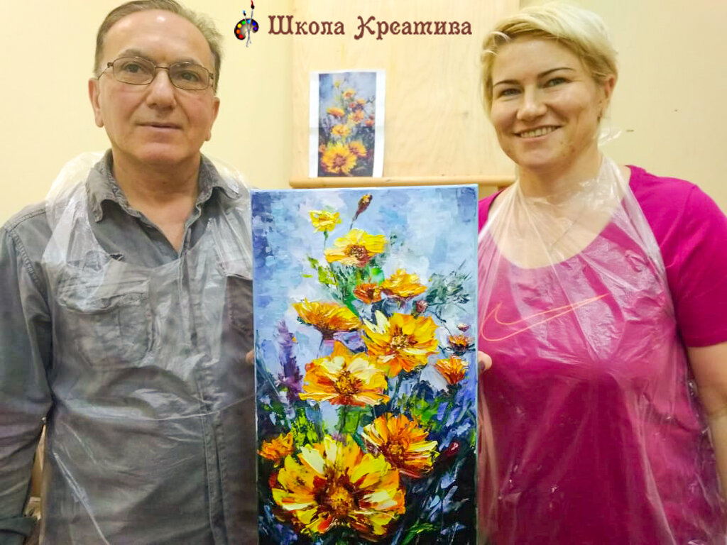 «На мастер-классе я получила навыки писания маслом на холсте, научилась смешивать разные цвета для получения нужных оттенков. Впервые попробовала мастихин. Узнала новые техники, новые имена художников. Познакомилась с интересными людьми, была приятно удивлена, что много талантливых людей, которые не имеют специального образования и никогда раньше не рисовали, творили исключительно красивые картины! Большое спасибо! Обязательно освою все уроки живописи маслом и буду развивать свои навыки рисования.