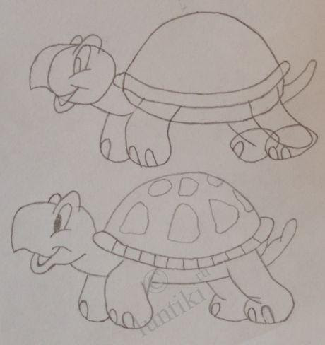 Изображать кого-то удобнее в профиль или сверху, рисунки анфас встречаются намного реже. От положения персонажа также зависит, как нарисовать черепаху. Портретное изображение получится милое и наглядное.