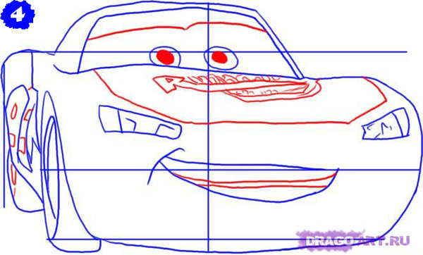 Постепенно убираем ненужные линии, дорисовываем недостающие детали машины – резные диски колес, боковые окна, зубы улыбки. Образ становится все более узнаваемый – добродушный и талантливый Молния Маквин оживает на глазах.
