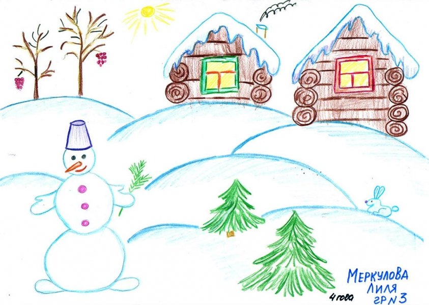 Мы составили небольшой список того, что нравится практически всем: заснеженный лес, снеговик, ярко-голубое небо и снегири. Приготовим также для работы набор цветных карандашей, ластик и простой карандаш.