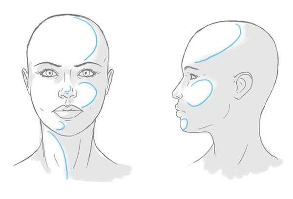 При применении затенения к менее ровным поверхностям сначала нарисуйте контурные линии своей формы, чтобы понять объем формы.Затем выберите положение вашего источника света и отметьте, где будут ваши блики. Линия тени будет имитировать или обтекать выделенные области, а затемнение будет распространяться вокруг этой формы от источника света.