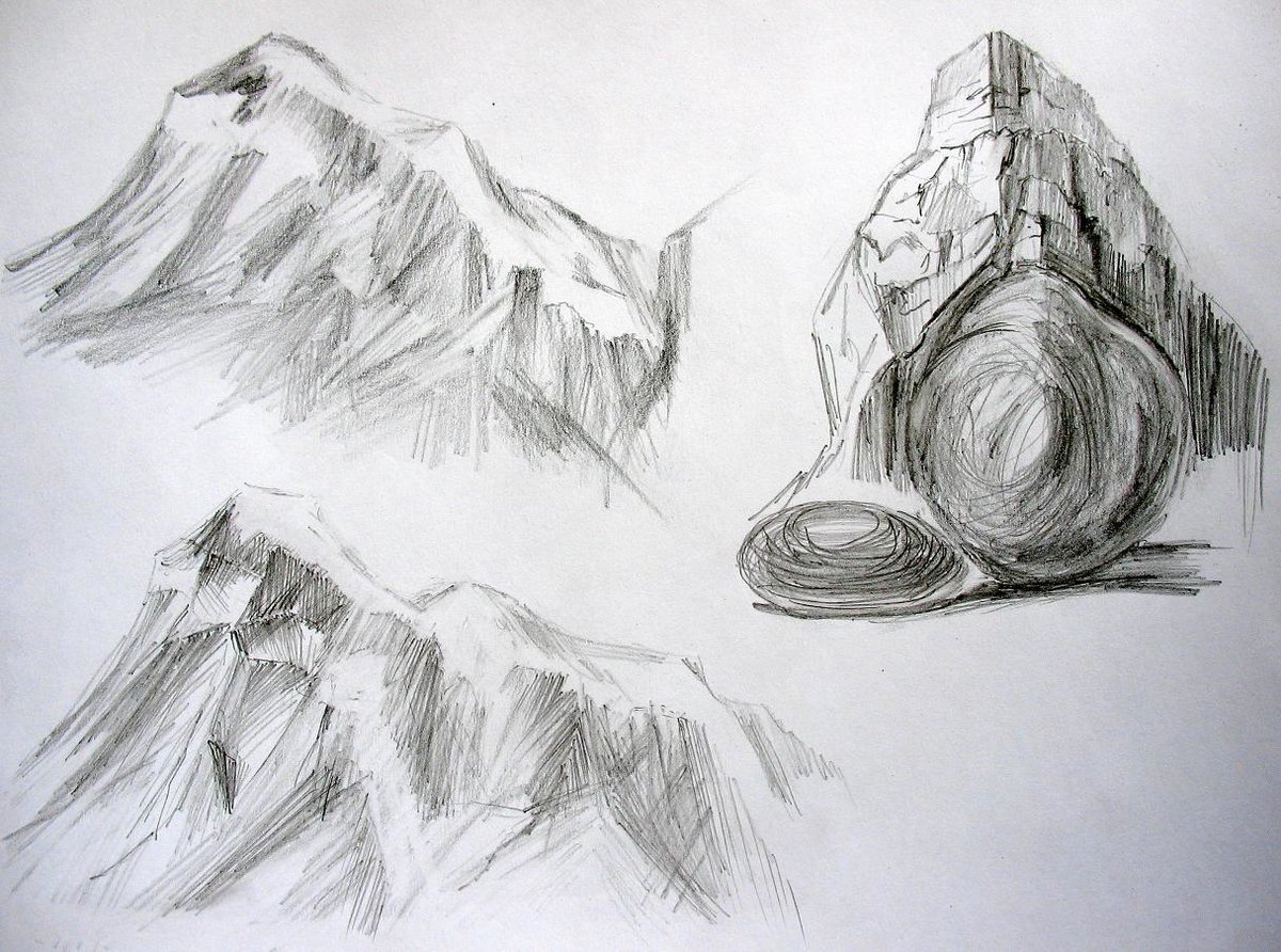 На этом эскизе изображены скалы со сглаженными углами, но все же видны плоскости, создающие объемную форму скал.