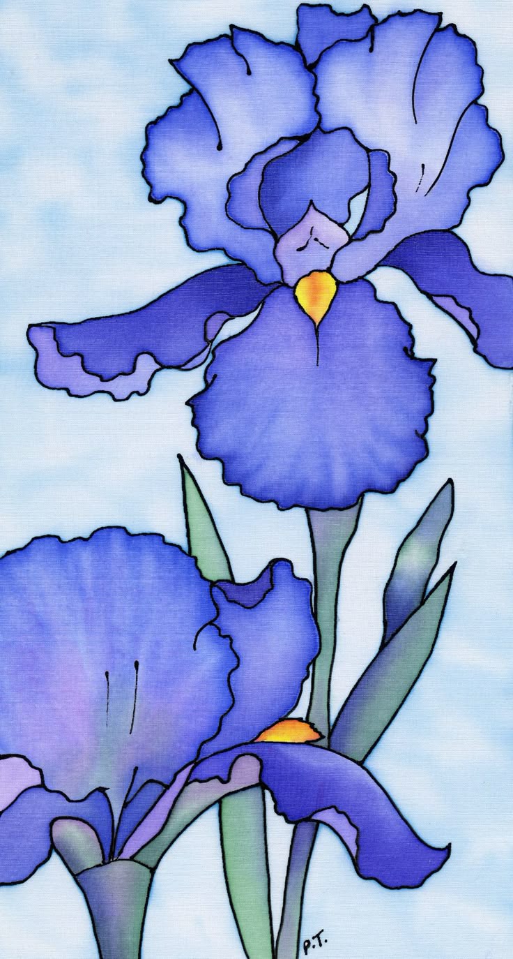 Характерная особенность ирисов — несколько опущенных вниз лепестков. Смочим бумагу водой (можно закрасить бледно-синим цветом) и по мокрой бумаге нарисуем полосочками «юбочку» лепестка так, как на рисунке ниже.