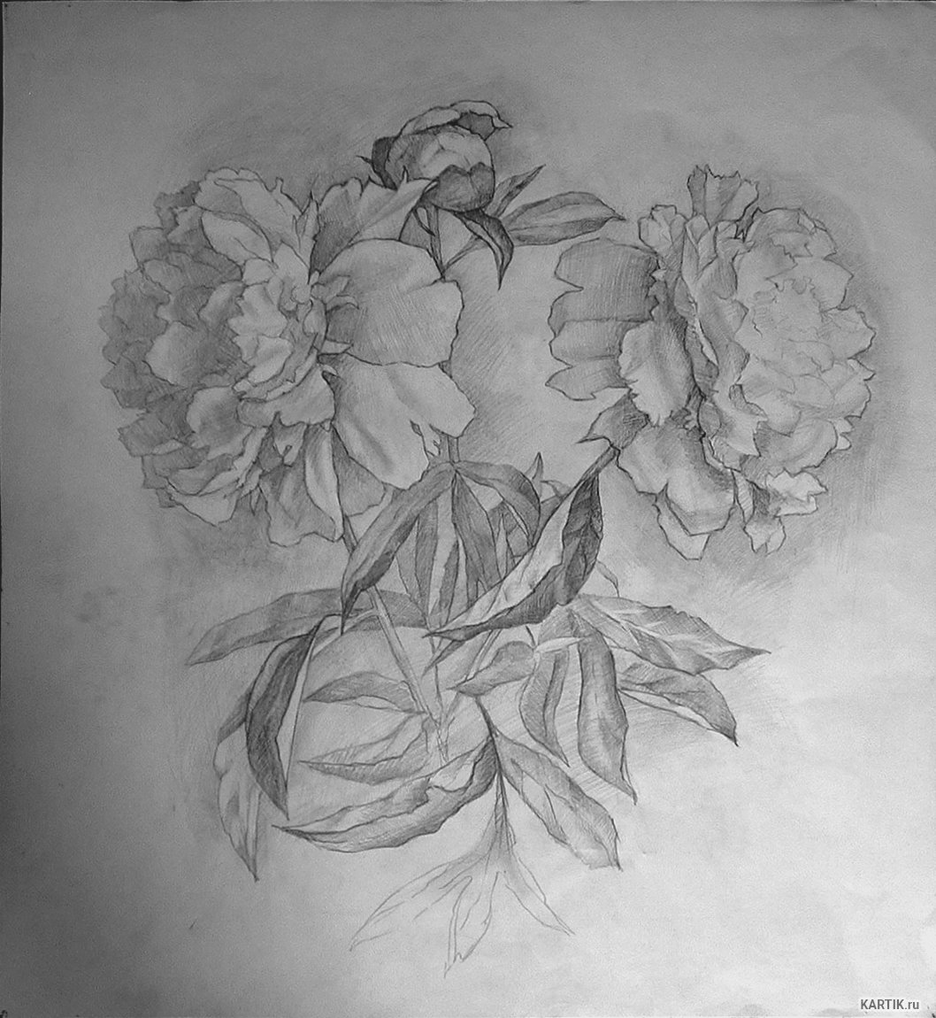 | Прорисовываем основные формы по массам лепестков пиона, определяем в пропорциональном соотношении размер и форму листочков, намечаем их в первоначальных, общих чертах. | Визуально определяем и уточняем характер формы лепестков соцветий пионов, форму листиков, делая акцент — активным штрихом и нажимом карандаша — на изгибах и переломах формы натуры.![]() |