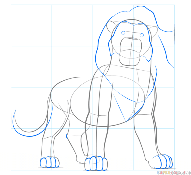 Теперь, когда лицо льва готово, нарисуйте гриву, а затем ноги.