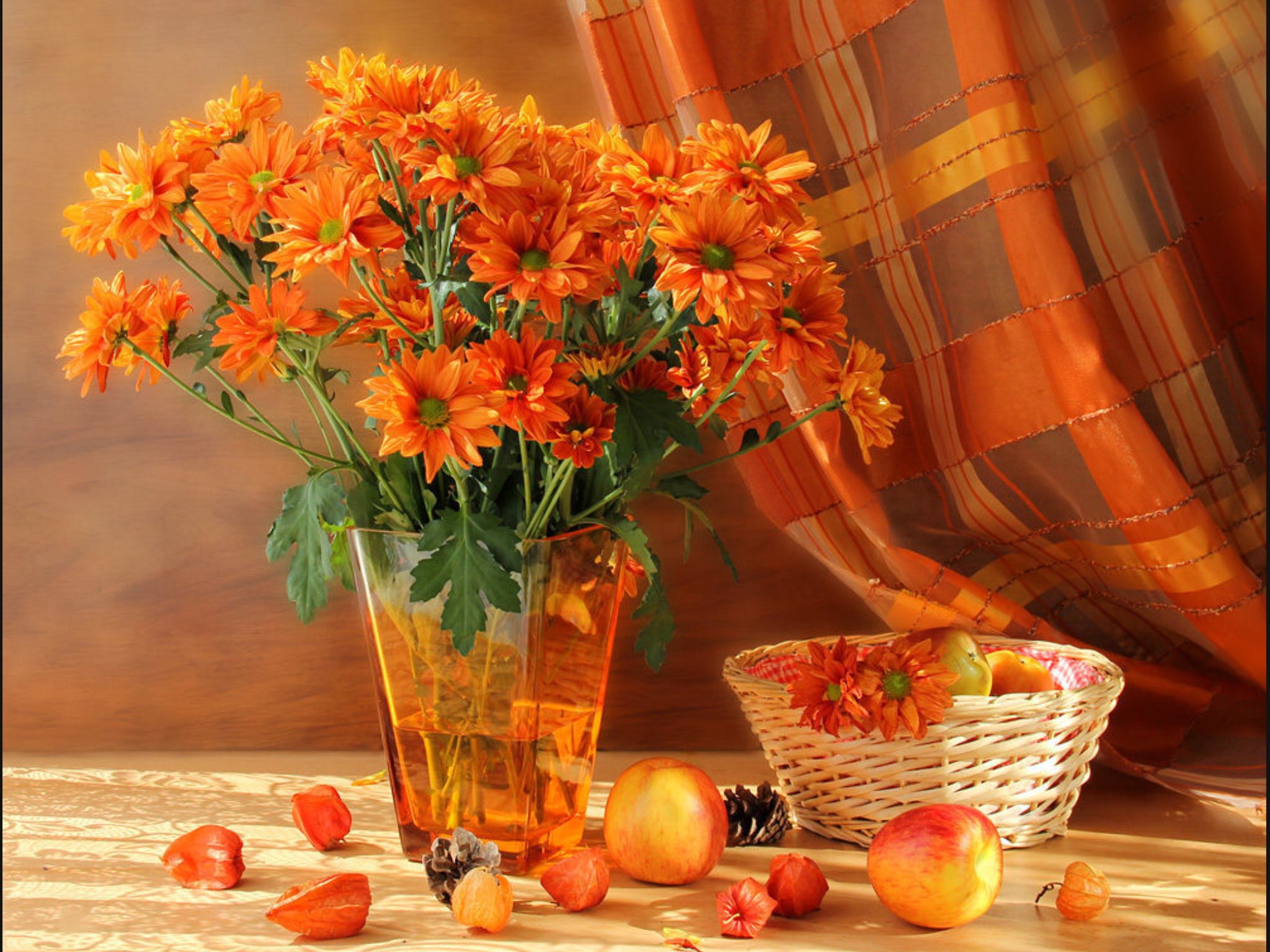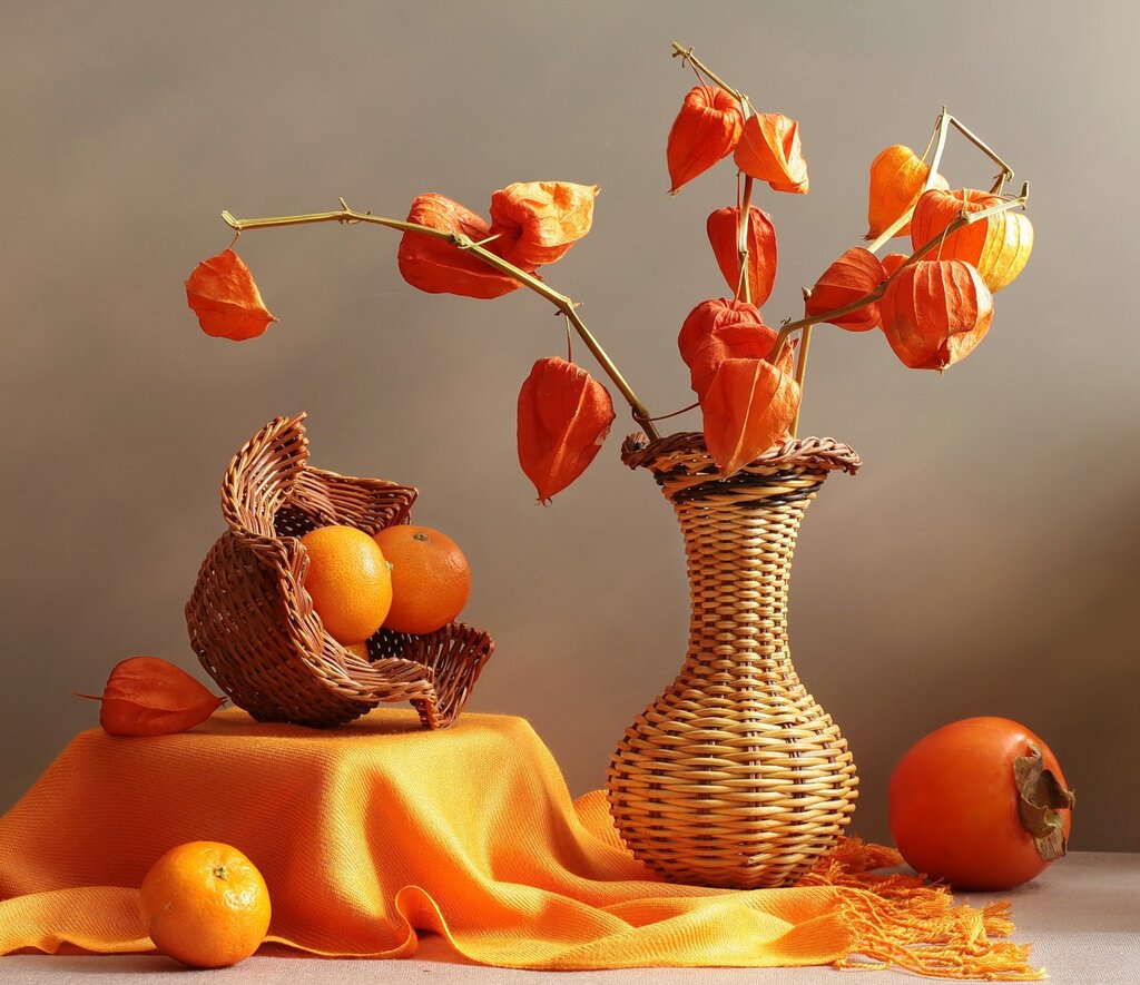 Декоративный натюрморт: Пример натюрморта на контрастных цветах (оранжевый-синий и красный-зелёный)
