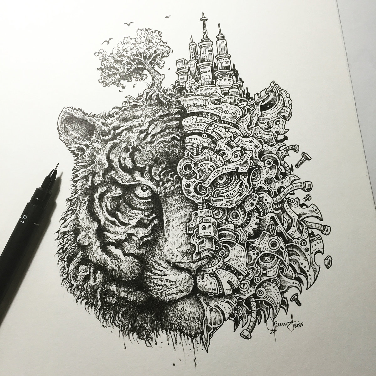 Гелевой черной ручкой удобнее всего рисовать контуры, а капиллярными — закрашивать фон, если у вас много мелких деталей.