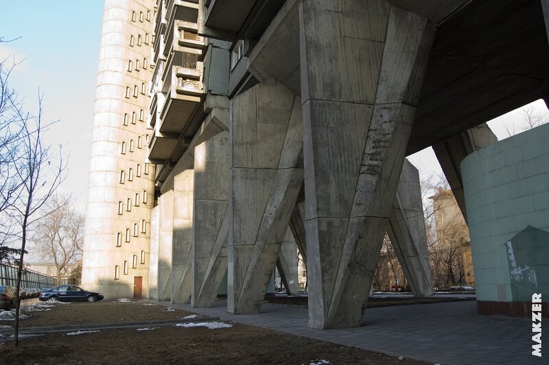 25-этажный дом на ножках на проспекте Мира построен в стиле брутализм по проекту архитектора Виктора Андреева и инженера Трифона Заикина. Благодаря 30 сваям первый этаж приподнят на уровень третьего, поэтому даже с нижних этажей открывается отличный вид на ВДНХ и окрестности.