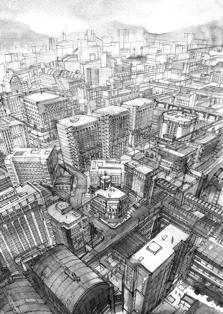 Продолжайте отрисовывать городской пейзаж, добавляя больше форм и деталей. Как вы можете видеть, я не стал в точности следовать своему эскизу. В некоторых местах нарисованная мной перспектива оказалось весьма далека от реальной, и это абсолютно нормально. Эскиз служит только базой для начала.