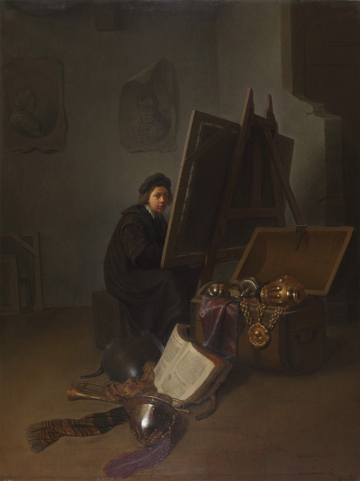 Дау — это первый ученик Рембрандта в Лейдене. Удивительно, что еще до того как он отправился в Амстердам, у него уже были ученики. Хотя, кажется, будто он в своих работах выбрал совсем другой путь. Эта работа, которая приписывается ему, очень важна. На ней изображен художник, который сидит за мольбертом и рисует разные объекты, которые есть в студии.