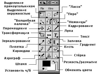 GIMP предоставляет большой набор инструментов для быстрого выполнения таких простых задач как создание выделений или контуров. Здесь детально описаны инструменты, находящиеся на панели инструментов программы.