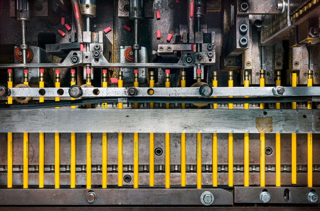 - Отдельные карандаши, вырезанные из бутерброда, готовы к дальнейшей обработке. Любые карандаши с дефектами, такие как нецентрированные грифели или сколы дерева, на этом этапе выбрасываются.