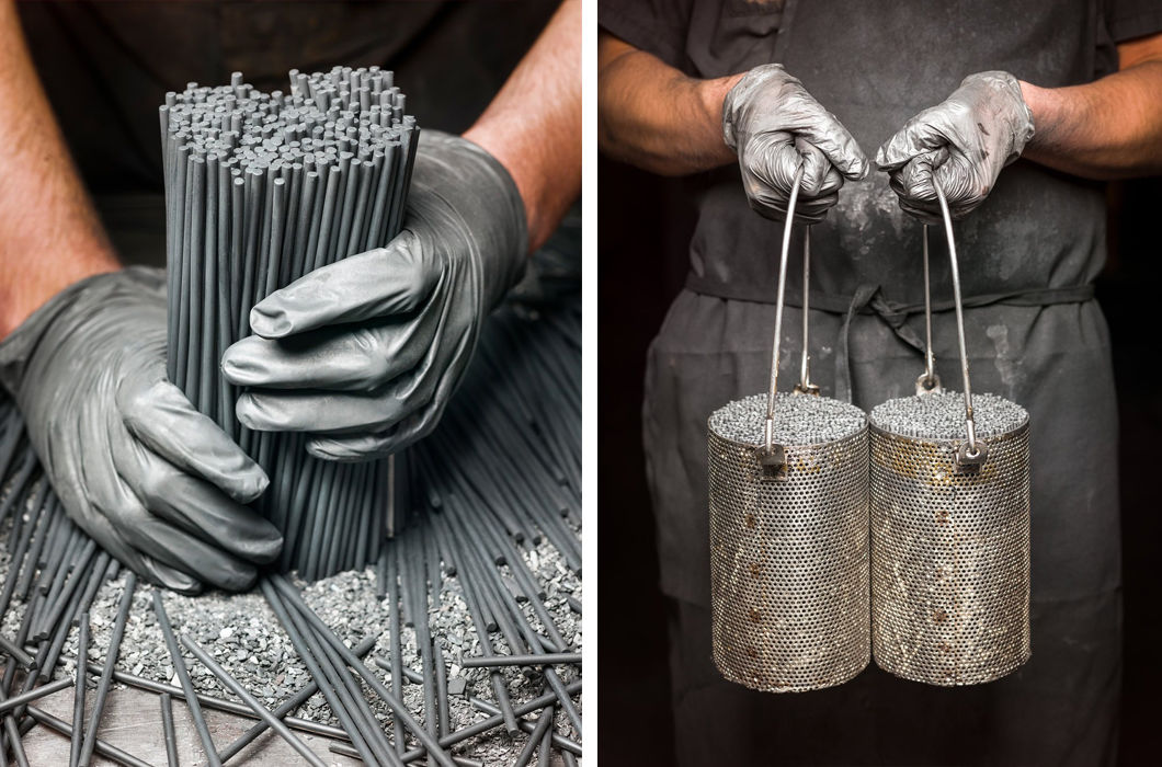 Стержни создаются из тщательно подготовленной массы, которая имеет определенную температуру и влажность. Важно, чтобы смесь не пересыхала, так как это скажется на износе оборудования. Вымешанное тесто специальным прессом формуется, затем пропускается через оборудование с дырочками, что делает массу похожей на лапшу. Эта лапша формируется в цилиндры, из которых выдавливаются стержни. Остается их только прокалить в специальных тиглях. Затем стержни подвергаются обжигу, а после него выполняется жировка: образовавшиеся поры под давлением и при конкретной температуре заполняются жиром, стеарином или воском.