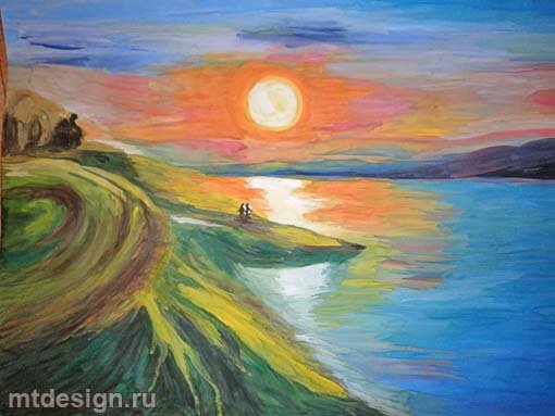 Волна, которая находится ближе к солнышку, должна быть больше. Волны рисовать по убыванию. Цвета волн можно чередовать – оранжевый с жёлтым или оранжевый с красным.