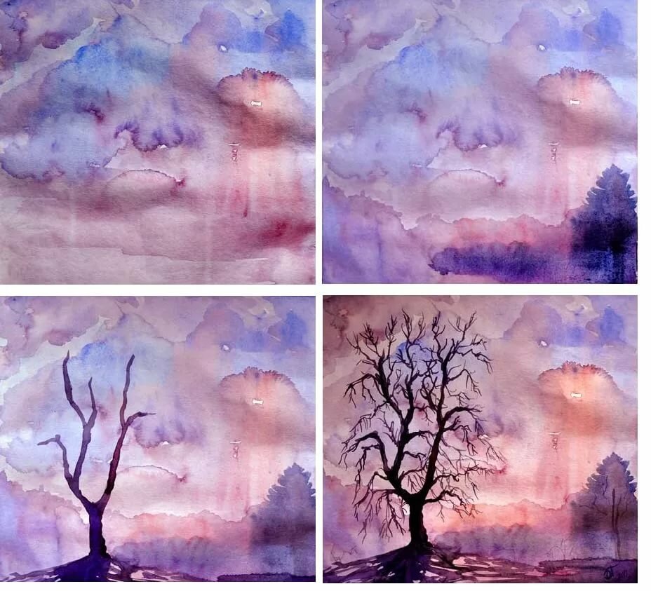 2 этап. Задача этого этапа состоит в том, чтобы выявить цветотональные отношения в пейзаже.