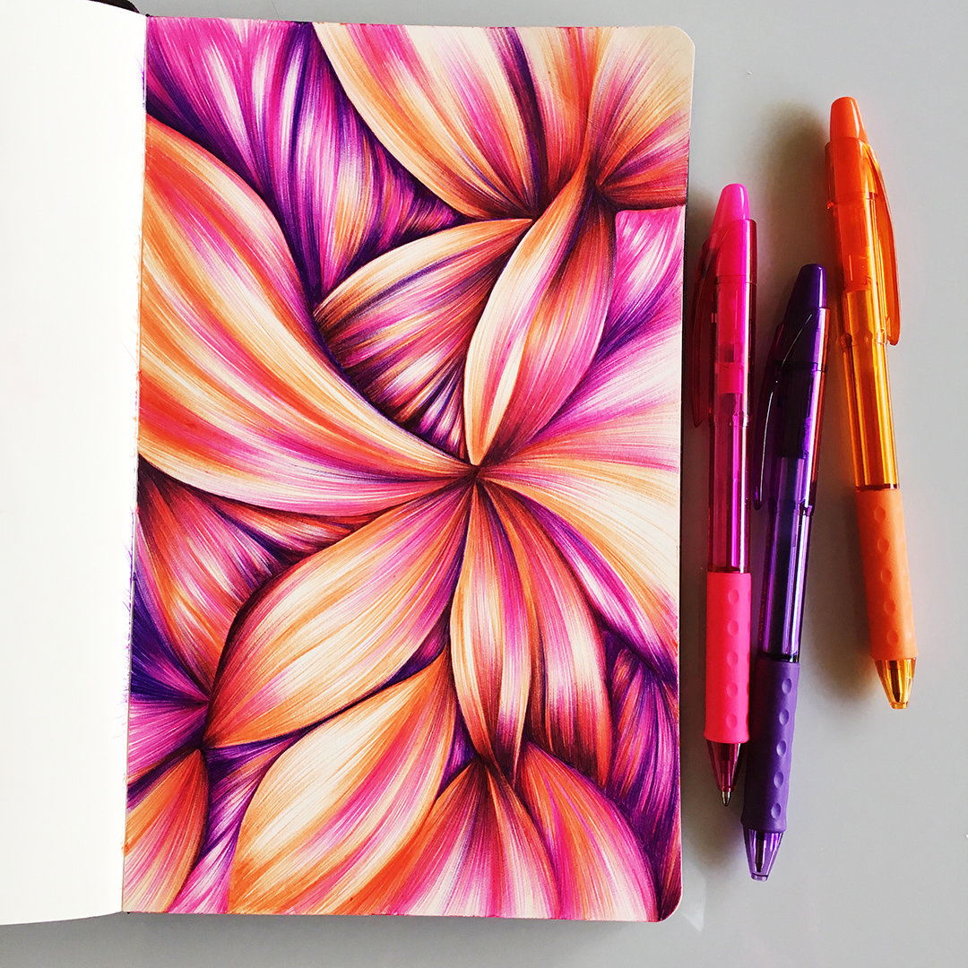Я добавляю цветы в качестве фона, используя ту же цветовую схему, что и в модели. Для контуров цветов я использую золотой металлический карандаш. Я не рисовала цветы сначала, потому что знала, что буду растушевывать эти светлые тона, рисуя волосы.