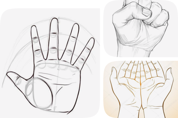 Всегда при изображении тела человека необходимо опираться на основы анатомии. Руки — не исключение. Размер кулака, например, определяется длиной и пальцев. И правило золотого сечения будет важным в любом положении пальцев, даже сжатых в кулак. Рисуя раскрытую ладонь, необходимо особое внимание уделить прорисовке линий пясти и чуть согнутым пальцам.
