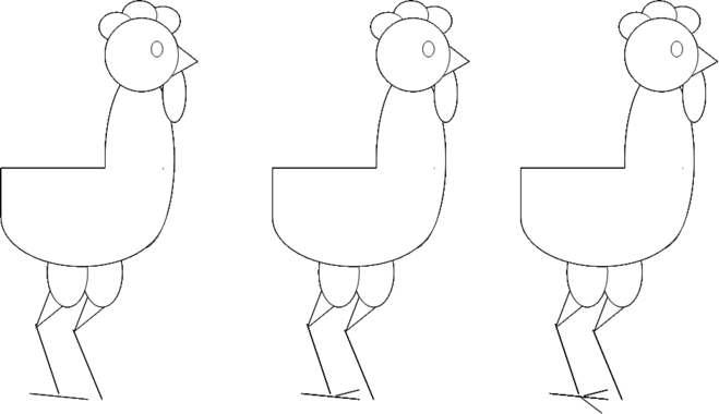 На предпоследней стадии урока о том, как рисовать петуха для начинающих, мы рисуем ноги — сначала они очень сужаются, а затем резко превращаются в обычные тонкие прямые линии.