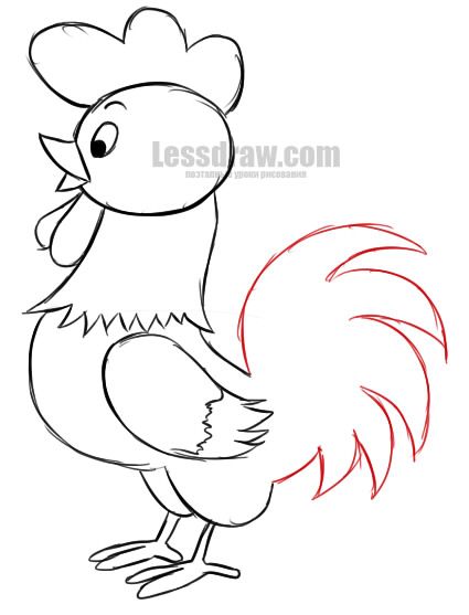 На этом этапе мы работаем над главной гордостью петуха — великолепным хвостом. Хвост выглядит как несколько изогнутых линий. Кстати, у нас есть еще один учебник рисования, посвященный пернатым животным, в котором мы говорим о том, как нарисовать голубя.