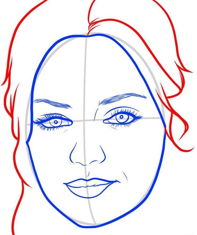 Теперь изобразите вертикальную линию, которая послужит нам ориентиром при изображении всех черт лица, помогая сделать их максимально пропорциональными и симметричными. Нарисуйте горизонтальную линию глаз, которая поможет наиболее правильно расположить глаза на лице.Изобразите линию носа и рта.