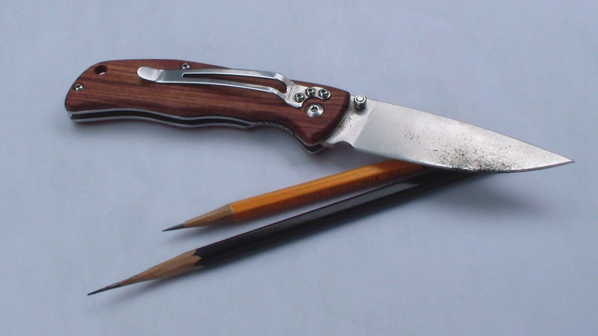 Все зависит от того, зачем и какие мы будем точить карандаши. Начнем с простого, обыкновенного грифельного карандаша. Как заточить карандаш, если под рукой нет точилки? Нет точилки – есть нож. Инструкция для правшей. В левую руку берем карандаш, в правую – нож, по направлению «от себя» кладем карандаш в открытую ладонь и на указательный палец.