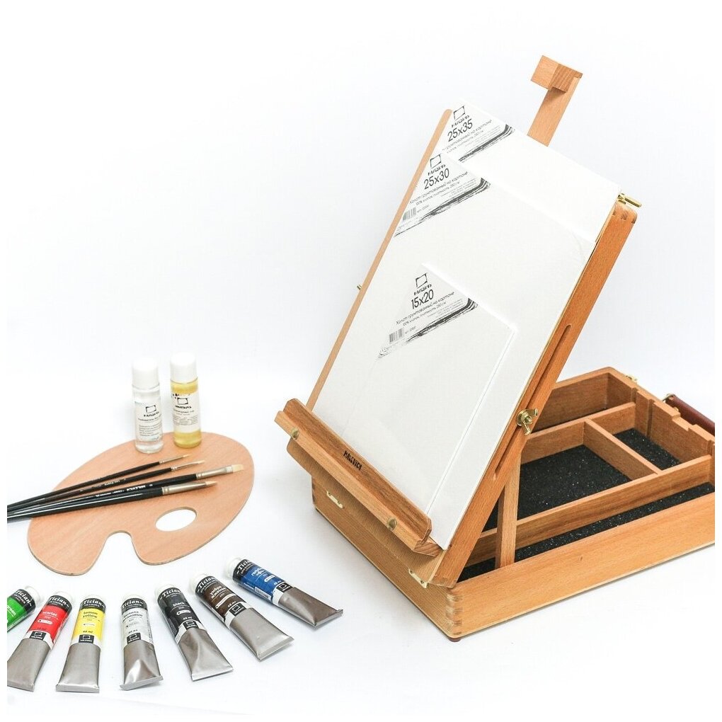 - 7. Настольный мольберт ART QIDOO для рисования и рисования, регулируемая деревянная подставка для мольберта с холстом, акриловая краска, кисти и палитры, портативный мольберт для рисования для детей, взрослых и художников