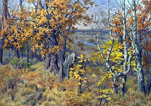 А теперь предлагаем полюбоваться восхитительным осенним днем, написанным С. Андриякой. Красочная гамма картины прекрасно передает постепенное увядание природы перед зимой.Зелень на кустах сохранилась, трава еще зеленая, но низкие ползучие туманы уже их «съедают».