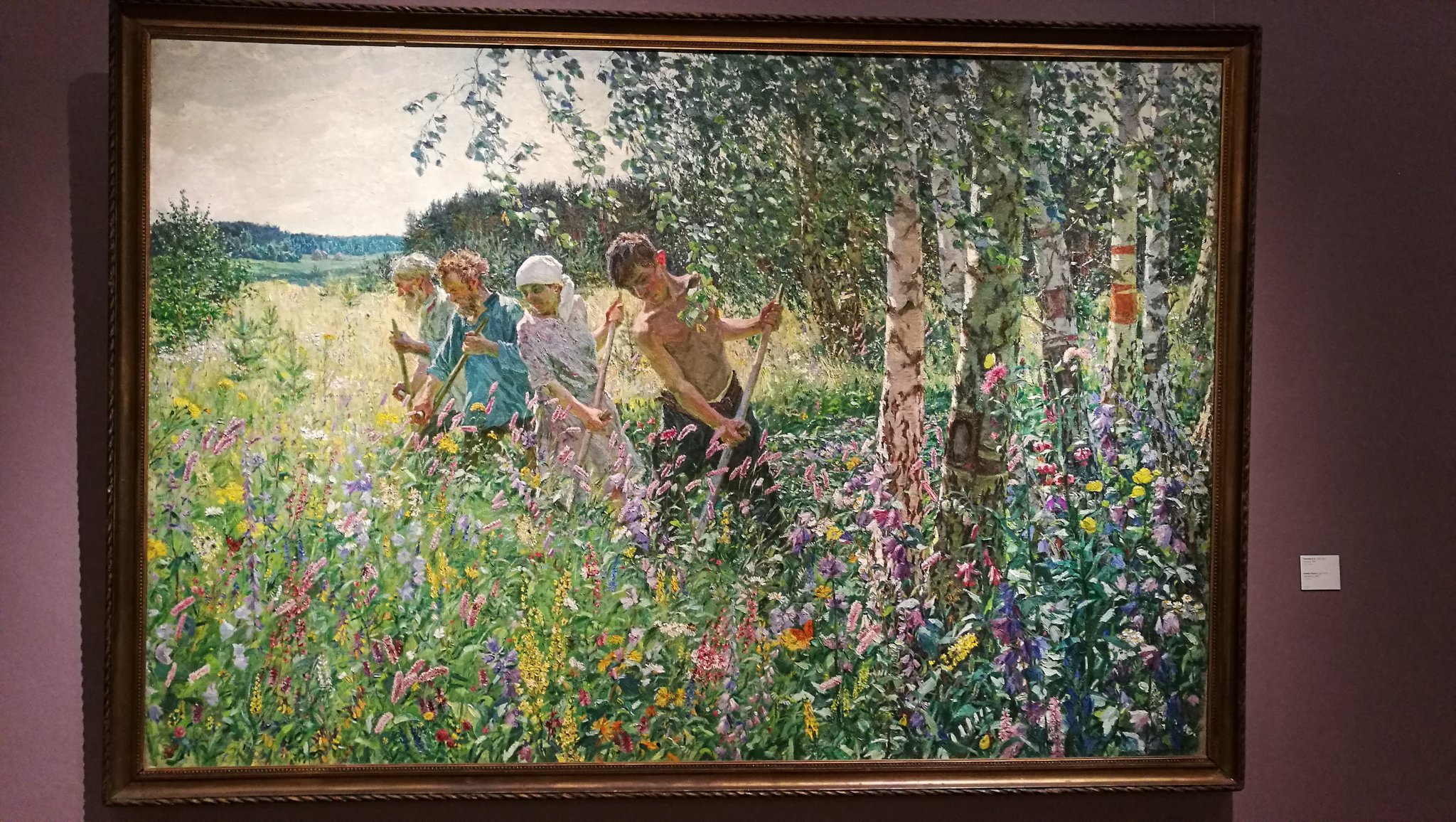 Июль, макушка лета, покос. Все работают дружно, в ряд, очень умело, не нанося вреда друг другу острыми косами. Как будто слышишь звук косы («вжик-вжик») и падающей травы. Зрителя зачаровывает цветущая опушка березняка с его ажурными веточками. Умолкли птицы, чувствуется все надвигающая жара и аромат свежескошенной луговой травы и цветов. Но это в радость. Сено будет просушено хорошо. На картине видно, что работает и стар, и млад.