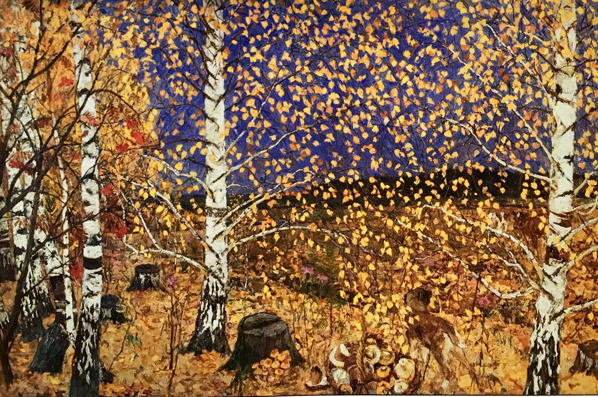 Рядом верный друг – собака, тоже набирается сил на обратный путь. Среди изумрудной зелени травы и белоствольных берез ярко выделяется и кумачовый платок девочки, и ее белоснежная одежда, и васильковое платье матери. Наполняет А. А. Пластов картины простым бесхитростным содержанием, близким русскому человеку.