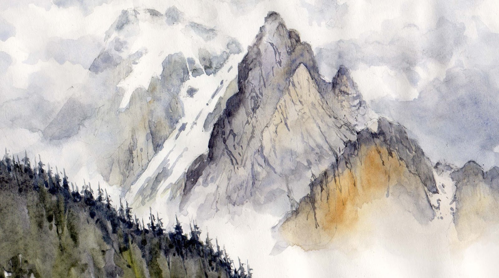 Нарисуйте мелкими мазками сухой кистью черные текстурные следы в некоторых областях только на левой белой стороне гор.