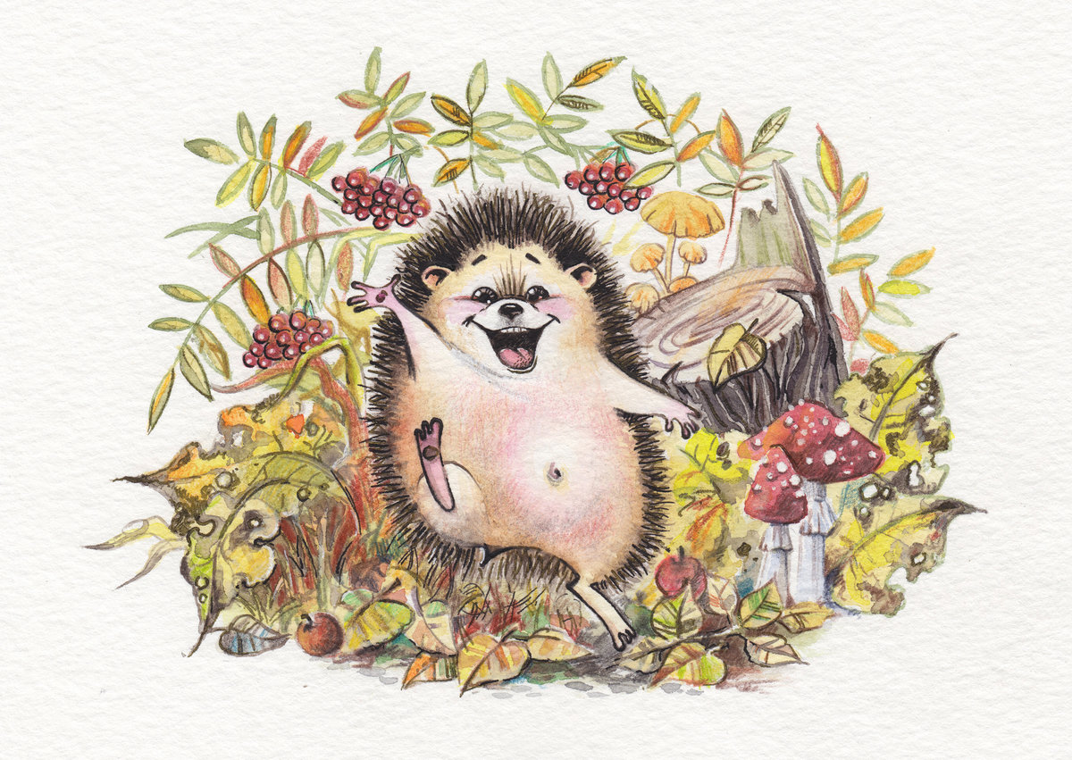 А сейчас самый ответственный момент — рисуем ёжику колючки и носик. Вырисовуем глаз и улыбающийся ротик.
