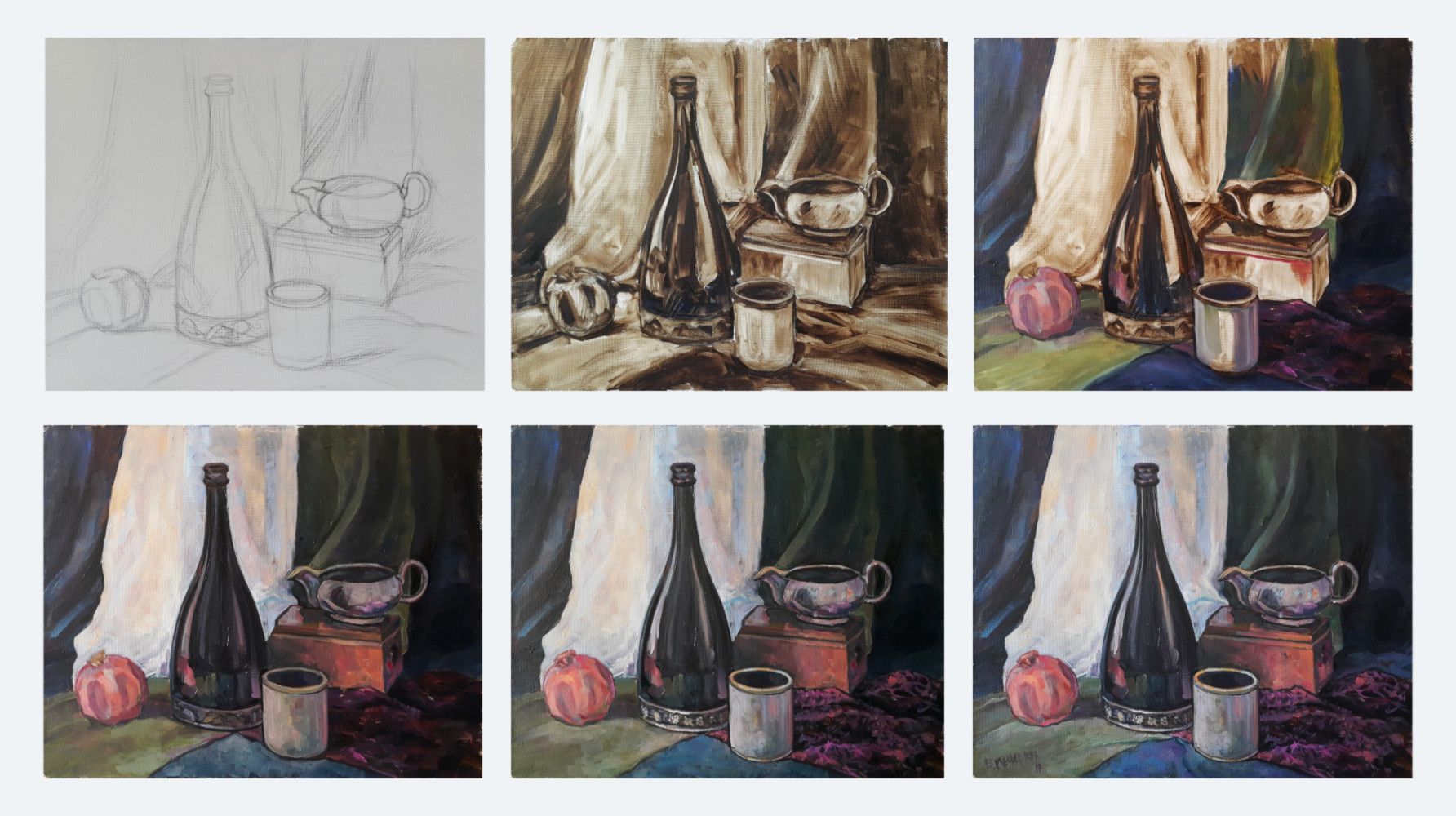 Первый подмалевокПосле того, как подготовительные работы проделаны, пора освоиться и решить натюрморт.Ранние этапы были связаны с основным цветом, ценностью и композицией и думали о картине как о скорее абстракции, чем репрезентативном изображении. Перед тем, как раскрашивать какие-либо детали, важно убедиться, что основные формальные качества уравновешены и сбалансированы.