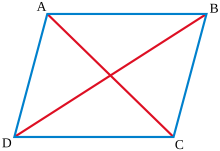 Противоположные углы параллелограмма равны по величине. Здесь угол A = угол C и угол B = угол D. | |
