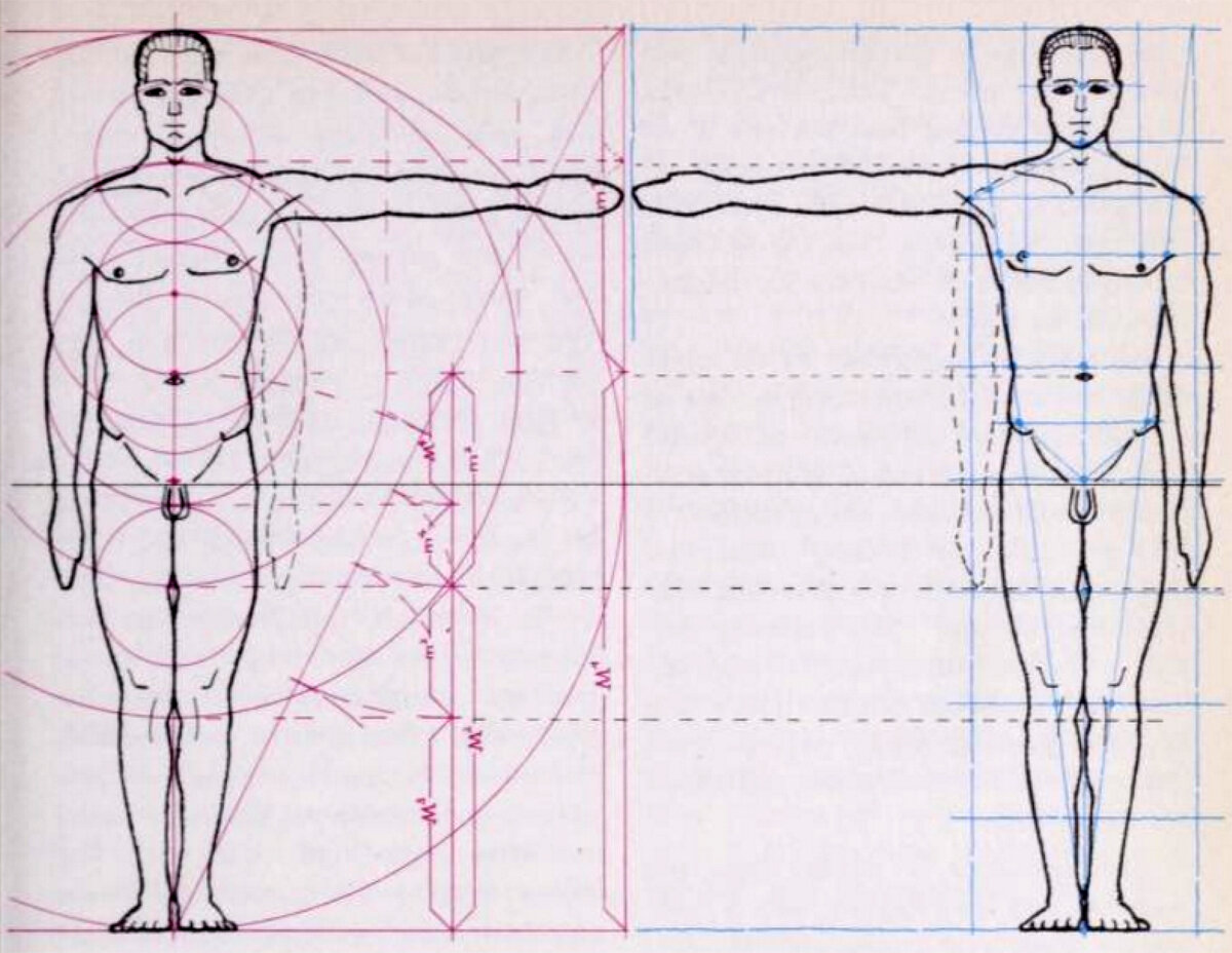 Центр груди примерно на две головы ниже тела, а пупок — на три головы вниз. Чуть выше этого уровня (середина туловища) находится локоть. Руки опускаются между основанием таза и выше колена.